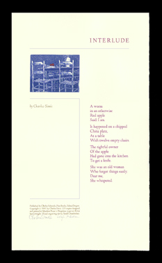Broadside. Published by Charles Seluzicki. Deepdene types on Rives Heavyweight.